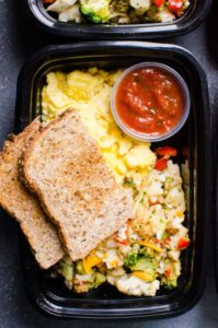 Healthy Breakfast Meal Prep with broccoli, cauliflower, bell pepper, eggs, salsa and whole grain toast for protein packed and veggie loaded breakfast on the go,
