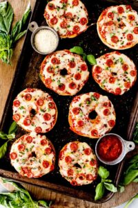 Home>> Homemade Pizza Bagels If you’re looking for the perfect snack to hold the kids over during winter break, try out these pizza bagels brought