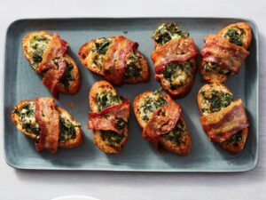 Home>> Bacon-Wrapped Spinach Dip Crostini Treat your guests this Thanksgiving with these delicious Bacon-Wrapped Spinach Dip Crostini’s from the Food Network! These crostini’s will make